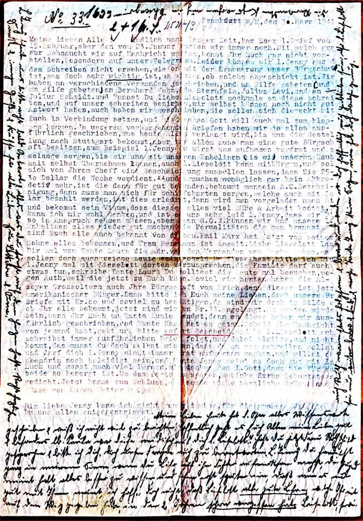 Endlich nach langer Zeit, kam Euer l. Brief vom 19. Februar, aber den vom 23. Januar warten wir immer noch. Mit welch großer Sehnsucht wir auf Nachricht warten, könnt Ihr Euch gar nicht vorstellen, besonders auf unser Telegramm. Leider können wir l. Jenny aus dem Schreiben nicht ersehen, wie es mit der Erneuerung unserer Bürgschaft ist, was doch sehr wichtig ist, zu wissen, ob solche abgeschickt ist. Wir haben an verschiedene Verwandten geschrieben, und um Hilfe gebeten. An Bernhard Kuhn, Ida Sternfels,1Ida Sternfels, geb. Strauß, ist eine in New York lebende Halbschwester von Settchen Guckenheimer. Julius Levi,2Julius Levi lebt in New York und ist der Mann von Tante Luzie, der Nichte von Adolf Guckenheimer. und an Julius Schmidt, und kannst Du liebe Lieselotte nochmals an diese schreiben, und [Dich] auf unser Schreiben beziehen. Wir selbst können noch nicht gut Antwort haben. Auch haben wir geschrieben, sie sollen sich direkt mit Euch in Verbindung setzen, und wird es so Gott will auch mal zum klappen kommen. In unseren vorhergehenden Briefen haben wir ja alles ausführlich geschrieben, was heute alles verlangt wird, bis man die Bestellung nach Stuttgart bekommt, aber vor allem muss man eine gute Bürgschaft besitzen, zum Beispiel l. Jenny du wirst uns aufnehmen vorerst und solange sorgen, bis wir uns mit unseren Enkelinnen unseren Haushalt selbst übernehmen können, auch l. Lieselotte kann mitbürgen, und soll sich von ihrem Chef eine Bescheinigung ausstellen lassen, dass sie 25-30 Dollar die Woche verdient. Und brauchen womöglich gar kein Akkreditiv mehr, ist die dann für gut befunden, bekommt man seine A. C. Bescheinigung, dann muss man sich für Schiffskarten sorgen, welche auch mit Dollar bezahlt werden, ist dies erledigt, dann wird man vorgeladen nach St.[Stuttgart] und bekommt sein Visum, dass dieses alles viel Mühe & Arbeit kostet, kann ich mir wohl denken, und ist es uns sehr leid l. Jenny, dass wir Dich so in Anspruch nehmen müssen, aber wenn G.[Große] G.[Gott] W.[Will] können wir und unsere Enkelinnen alles wieder gut machen. Die Formalitäten die man braucht sind Euch allen auch bekannt von drüben. Emil Marx3Emil Marx ist der Vater von Martin Marx. Er hat die Ausreise zu seinem Sohn in Chicago nicht geschafft und wurde 1942 nach Auschwitz deportiert. hat jetzt von seinem Sohne alles bekommen, und Frau Herrmann4Johanna Herrmann, geb. Gutmann (*23.09.1879 in Kassel), war eine Nachbarin aus der Wolfsgangstr. 28 und wanderte am 13.07.1941 nach New York aus. ist soweit. Liebe Lieselotte, lass Dir mal von Tante Laura die Adr.[Adresse] Von den Verwandten von Kochs geben, es sollen doch auch reiche Leute sein, sobald Du diese hast, bitte ich Dich l. Jenny mal mit Lieselott dorten vorzusprechen, die Familie darf auch etwas tun, schreibe Tante Laura Du solltest die Leute mal besuchen, wegen Ruth, weil die jetzt zu Euch käme. Soviel wir hörten, hab die Alzeyer Grosseltern auch ihre Bürgschaft von Erich, denn dieser ist jetzt amerikanischer Bürger. Dann bitte ich Euch meine Lieben, doch unsere Briefe mit Nr. so und soviel zu bestätigen, da sind wir doch im Bilde, ob Ihr alle bekommt, jetzt sind wir an Nr. 33. angelangt. Am besten wird’s sein, wenn Ihr Euch an Tante Luzie5Luzie Levi ist die Nichte von Adolf Guckenheimer, die in New York lebt mit ihrem Mann Julius Levi. wendet, denn an diese haben wir ausführlich geschrieben, und Tante Rosa6Tante Rosa ist die Schwägerin von Adolf Guckenheimer in Wiesbaden und die Mutter von Luzie Levi. hat es getan. Sobald Ihr Nachricht von jemand habt, gebt uns bitte sofort Bescheid, und Du l. Lieselotte schreibst immer ausführlichen Brief folgt, und dabei bleibts, und nichts kommt, das musst du doch selbst wissen, dass du an uns schreiben sollst und darf dich l. Jenny nicht immer erst aufmerksam machen, und willst obendrein noch beleidigt sein, und Tante Jenny meint es doch gut mit Euch und musst noch viel lernen, wir danken dem l. Gott, dass sie für Euch beide so besorgt ist. Um das Porto zu sparen, schicke Ruths Geburtstagsgedicht. Jetzt komme zum Schluss, und sende viele herzliche Grüsse und Küssen von Eurem Vetter & Opa